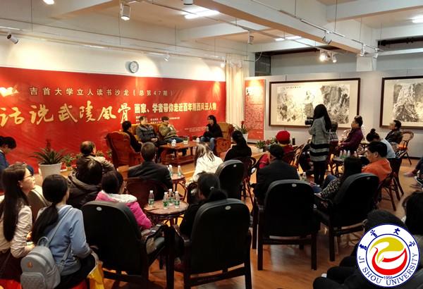 11月12日晚,著名画家、张家界市美术协会主席、我校舒湘汉教授,湘西本土文化学者、我校吕华明教授和青年评论家、我校刘泰然博士来到“武陵风骨”舒湘汉中国画人物作品展现场举行的立人读书沙龙,一道品味画展,话说武陵风骨,走进百年湘西风云人物。我校工会常务副主席肖廷飞及校内外书友共同参与沙龙,沙龙由胡建文副教授主持。
